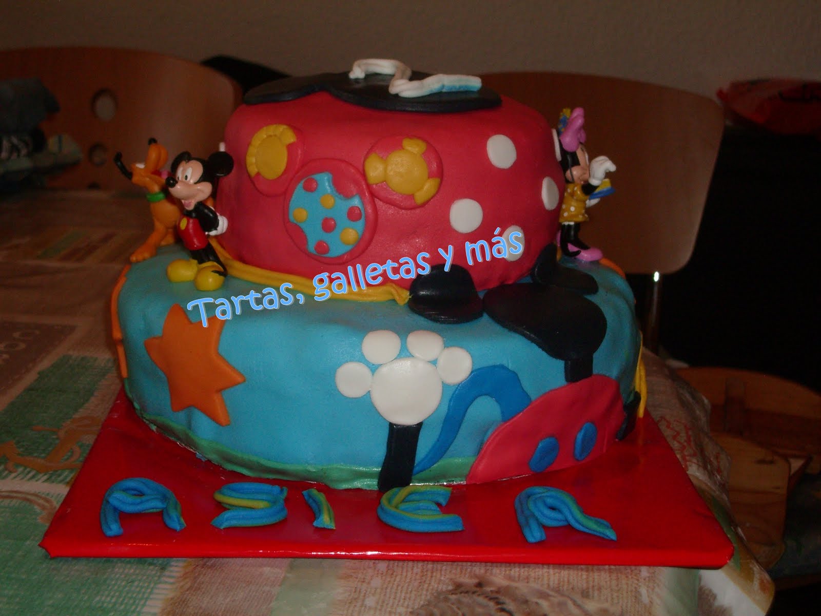 Esta es la tarta que hice para el verdadero cumpleaños de mi hijo, que fue el 30 dde julio. Quería hacer otra cosa, pero hacía muchísima humedad (si es que no aprendo jeje) y no se secaba el fondant, así que tuve que improvisar sobre la marcha.