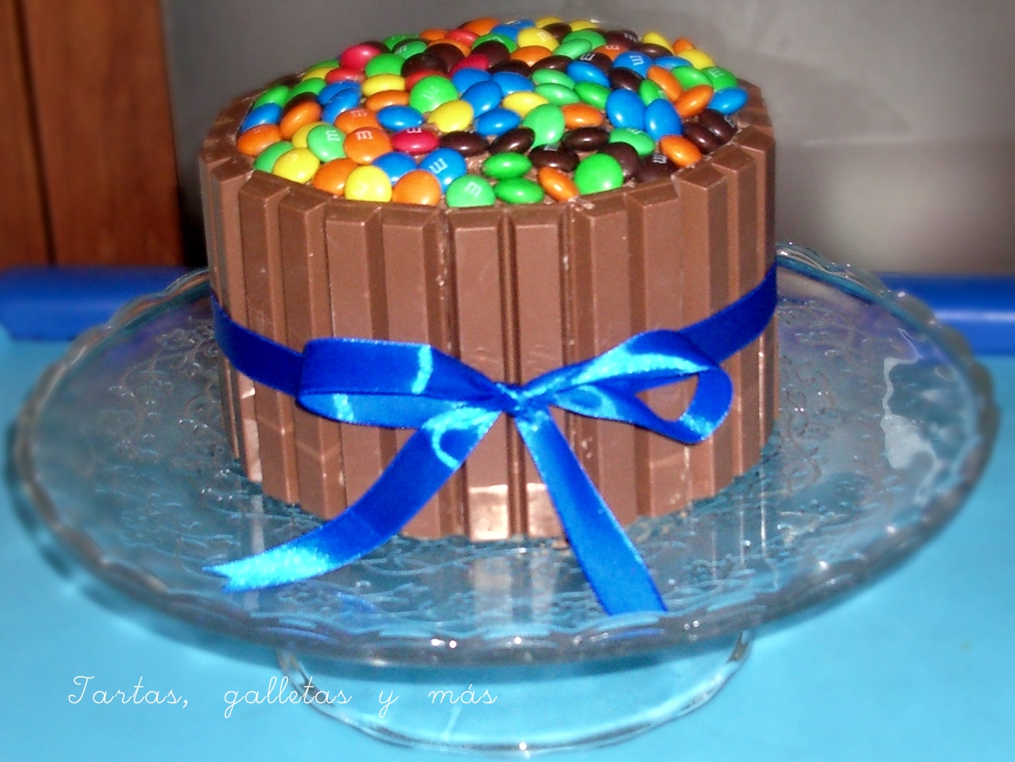 Ponemos alternativamente capas de bizcocho y relleno, hasta terminar con una de bizcocho. Untamos toda la tarta por fuera con crema del relleno si nos ha sobrado algo, si no, con nutella y vamos pegando alrededor las barritas de kitkat. Cubrimos la superficie con lacasitos o M&M's y adornamos con el lazo.