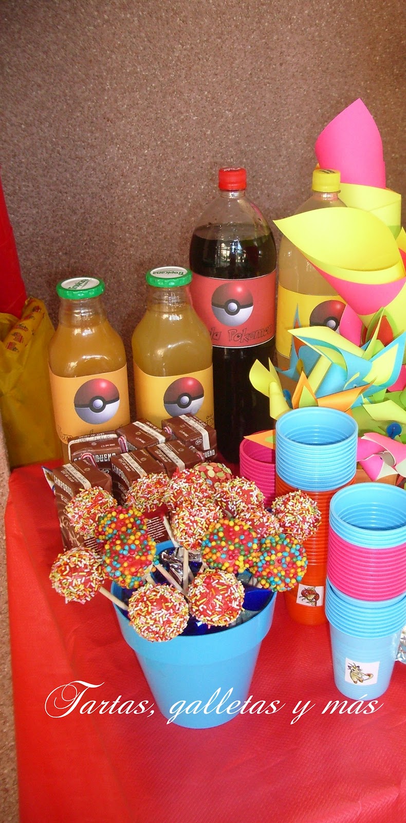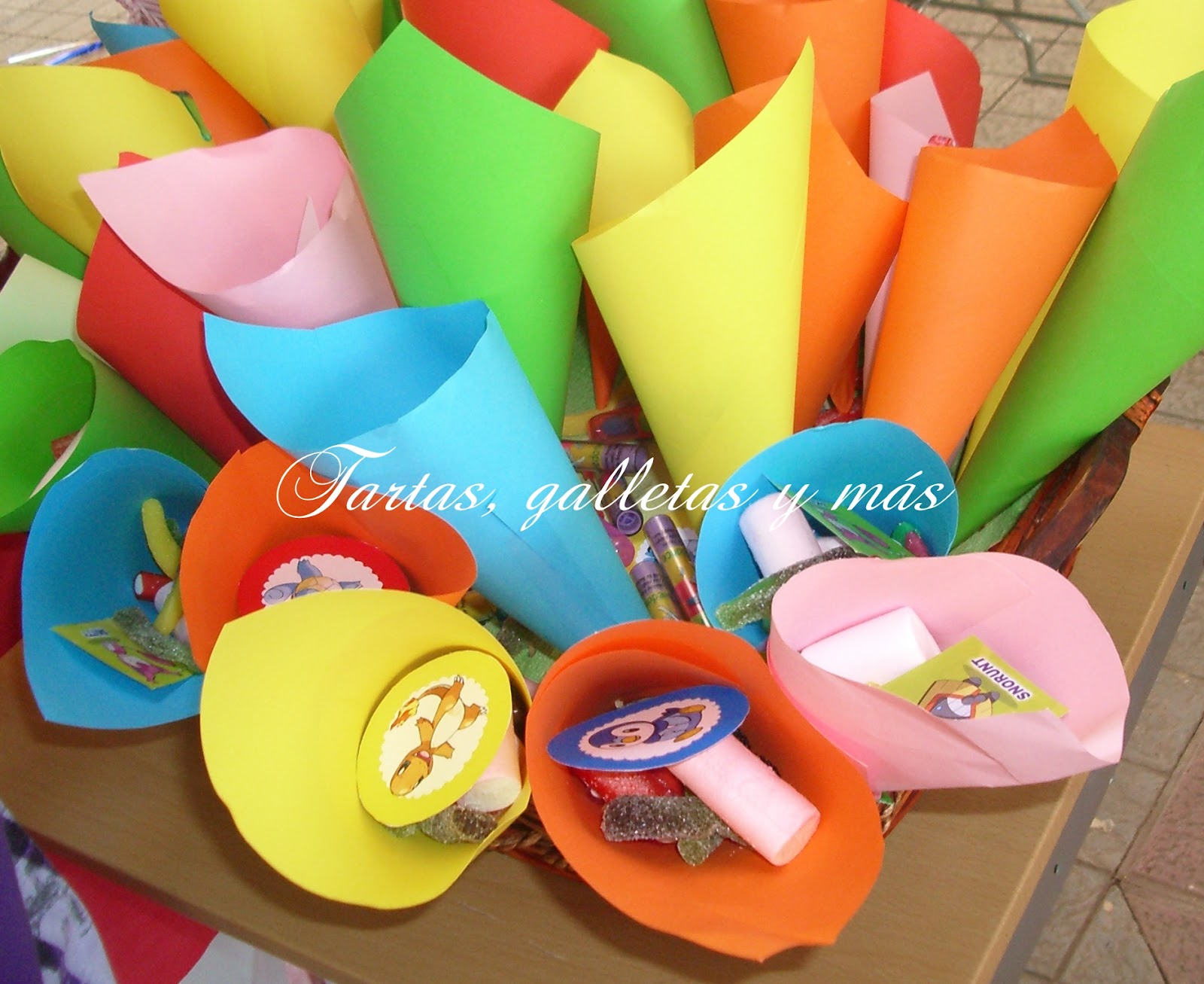 Hice las torres de rkt (rice krispies treats)* que son cereales con nubes derretidas. No pesa mucho y se pueden hacer estructuras bastante resistentes. Los conos son cucuruchos de helado cubiertos de fondant, quería que todo fuese comestible (menos la bandeja, claro!) por si a los peques se les antojaba comerse una torre que no se quedasen con las ganas.
